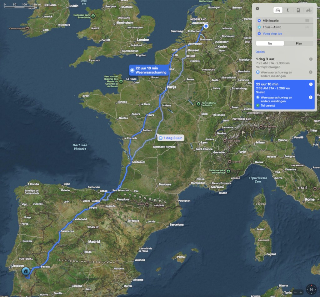 Begin December ga ik alleen met de auto met trailer afgeladen naar Portugal rijden. Het idee is om ’s ochtends vroeg te vertrekken, dan in de avond aan te komen bij de Spaanse grens, een korte overnachting te plannen, om vervolgens de volgende dag door te rijden via Spanje naar Portugal om daar eind van de middag / begin van de avond aan te komen. Omdat het de eerste keer is neem ik, mede op advies van bekenden, de route via de tolwegen: deze is ca. 50km korter en bijna 4 uur sneller. Bovendien rijd het een stuk relaxter. De totale rit is dan ca. 2.350km lang en je bent ongeveer 23 uur onderweg als je continue doorrijd.