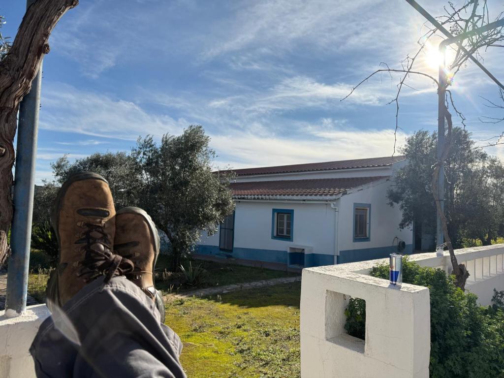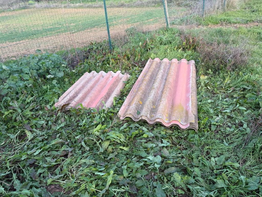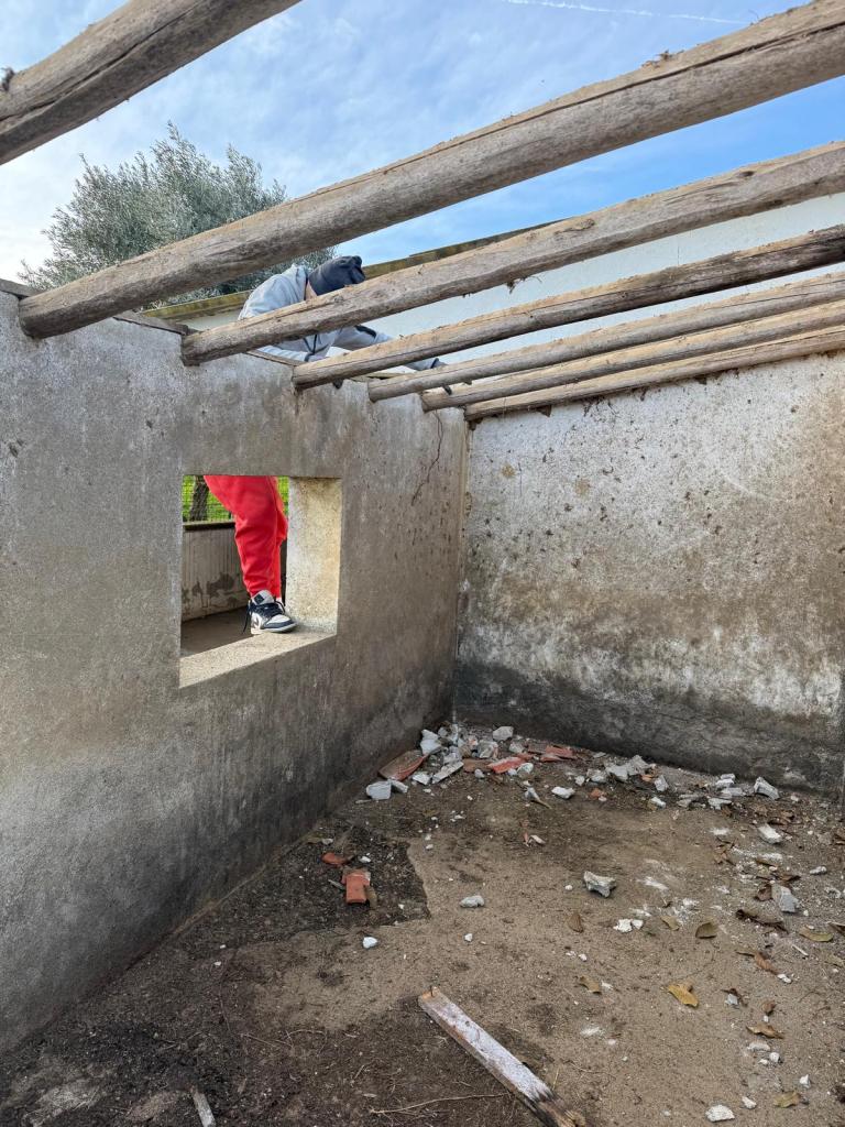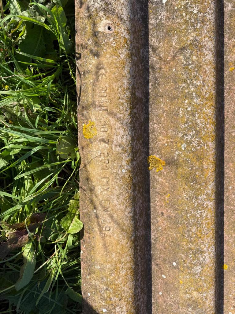Hier liggen golfplaten op waarvan niet vaststaat of deze asbest bevatten. In Portugal is men behoorlijk vrijer in het omgaan met asbest ten opzichte van Nederland. Toch wil ik geen enkel risico nemen en start de demontage in mijn uppie met een stofmasker op. Als ik de eerste platen los heb kom ik een ingestanste code tegen. Al eerder had ik opgezocht dat als er een code opstaat als “AT”, “NF” of “CAF” de platen asbesthoudend zijn. De code bevat echter de term “NT” wat staat voor “New Technology”, een codering voor asbestvrije golfplaten. Het stofmasker kan dan ook weer af! De platen komen in zijn geheel van het dak behalve de platen die tegen de gevel ingemetseld zijn: die scheuren af bij de laatste golf. Deze platen kunnen we nog hergebruiken om straks ergens een schaduwplek voor de paarden te realiseren.