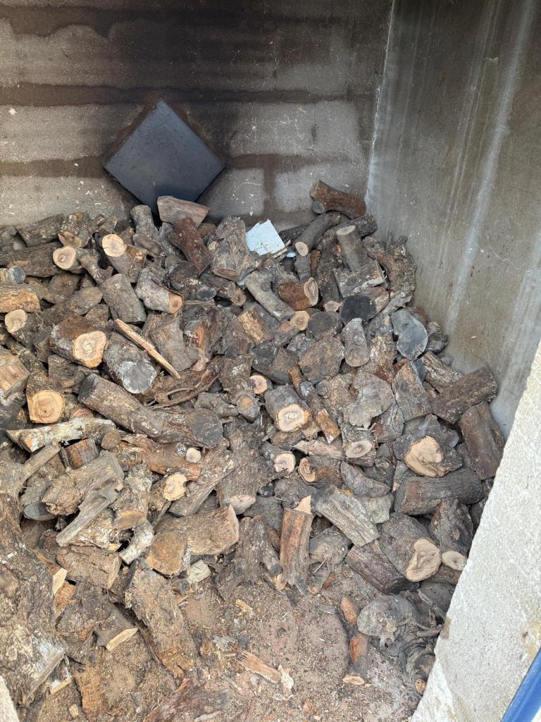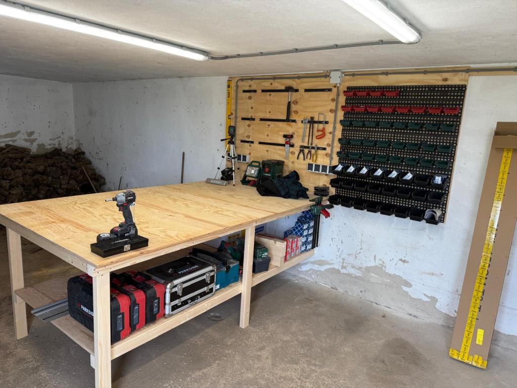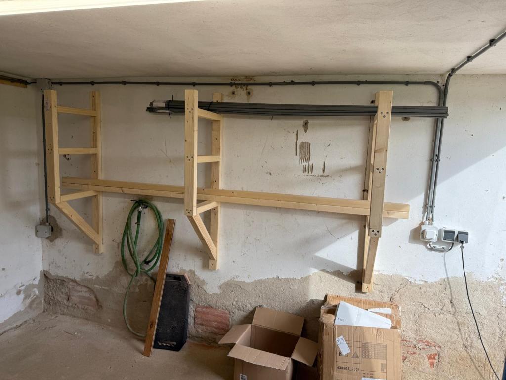 Enfin, in de werkplaats wil ik de werkbank nog verder afmaken door de organizers te monteren en een constructie te maken voor het netjes opbergen van langere onderdelen. Zo rond 10:30 komt Nick zich melden voor zijn corvee 😉: hij kan gelijk aan de slag! Er ligt nog behoorlijk wat hout van de olijfbomen dat kort gemaakt moet worden voor de kachel. Als het kort gemaakt is dient het opgeslagen te worden in een ruimte die in het verleden als rokerij heeft gediend, nog goed zichtbaar door de zwarte achterwand.