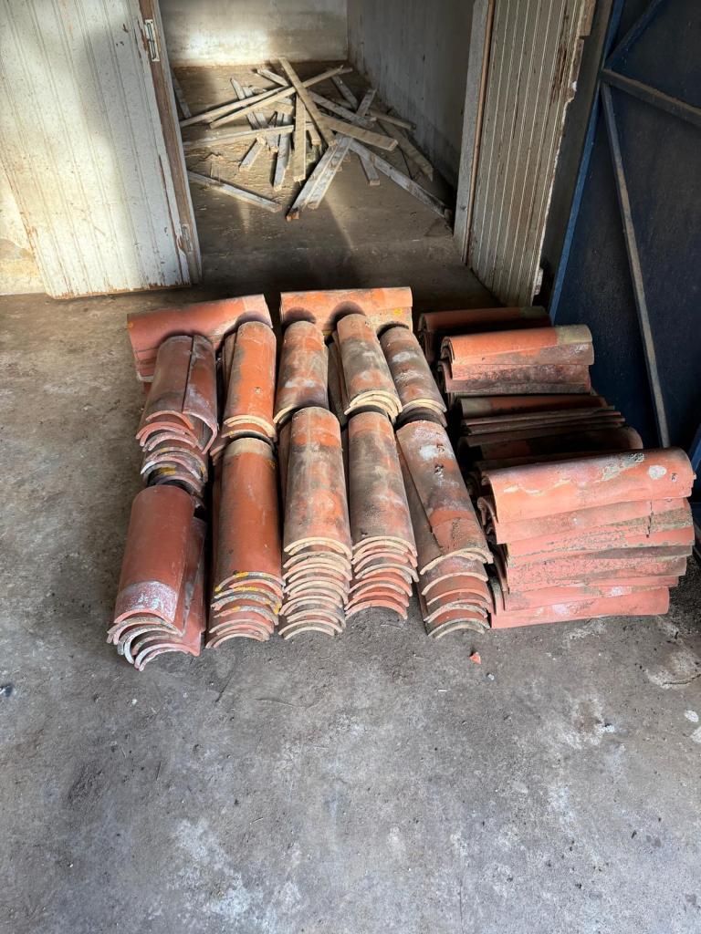 Het linkerdeel op de eerdere foto bevat een dak met Portugese dakpannen, echt een heel simpele manier van dakbedekking. Alleen aan de boven en onderkant zitten de dakpannen ingemetseld, daartussen liggen ze in verband los. Dit wordt ook netjes gedemonteerd en ook de dakpannen worden apart gelegd om eventueel later ergens te kunnen hergebruiken. De panlatten worden ook verwijderd en zullen klein gemaakt worden voor de kachel.