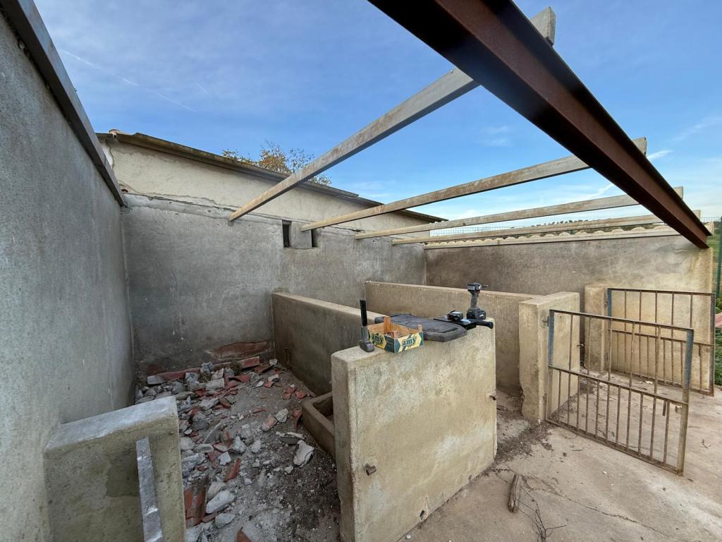 We starten de sloop door de oude varkenshokken te gaan demonteren. We kunnen deze op geen enkele manier trachten te hergebruiken: ze zijn zowel in de hoogte, de breedte als de diepte te klein voor onze paarden. Projectmatig werken we van boven naar beneden, dus we starten met het demonteren van het dak.
