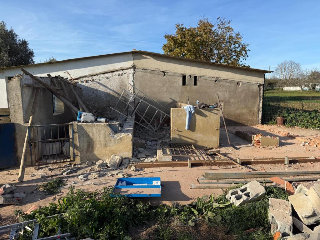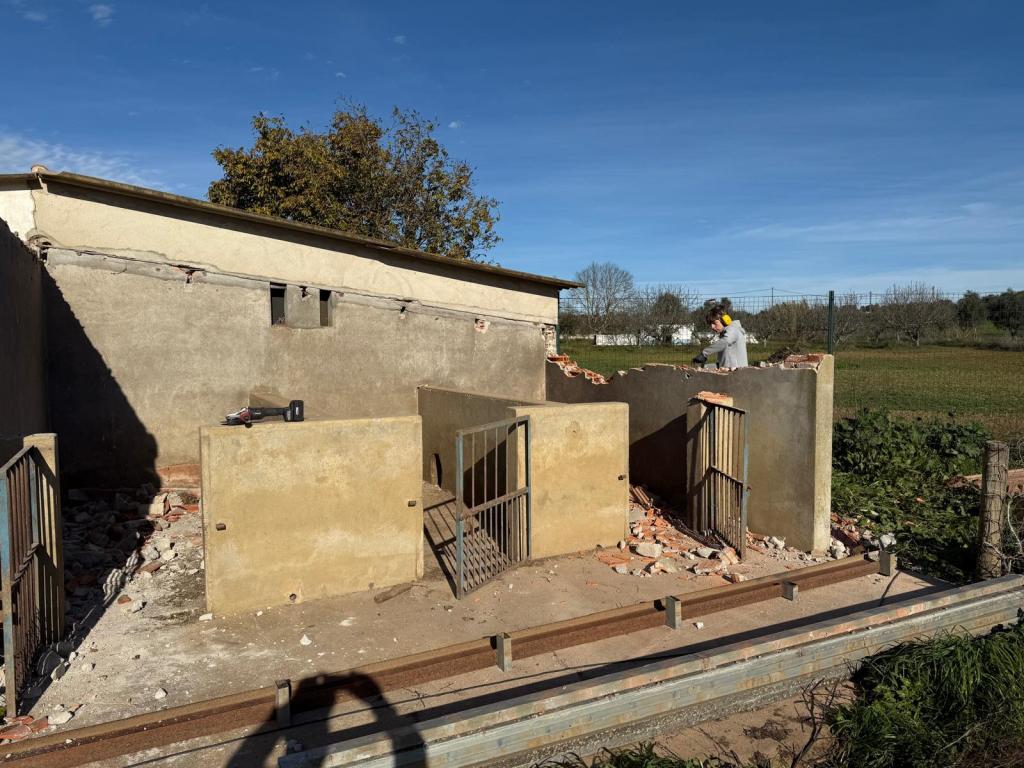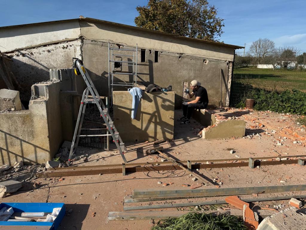 We starten vandaag met de stalen balken van het rechter gedeelte van de varkensstallen. De balken worden doorgeslepen met de haakse slijper zodat de dwarsbalken uit de betonnen gevel “gewrikt” kunnen worden. Vervolgens kan met de sloophamer de stalen balk vrij gemaakt worden zodat deze naar beneden gehaald kan worden. Met een heerlijk zonnetje en een aangename temperatuur van 16 graden voelt het warmer aan: als snel gaat de trui uit!
