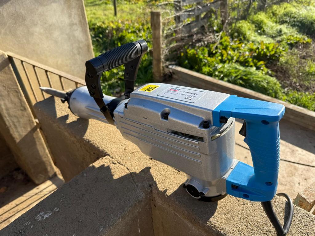 Voor het sloopwerk hebben we geïnvesteerd in een zware sloophamer. Ik had al een sloophamertje van 2 joules (slagkracht) maar dat is meer om tegels van de muur te halen. Bij HBM Machines dus een zware sloophamer aangeschaft met een slagkracht van 45 joules! Het apparaat weegt 24 kilo, goed voor het trainen van de armen en schouders! Met dit monster gaan we de muren te lijf: we zoeken even naar de juiste manier hoe we effectief de muur kunnen slechten: de stenen zijn voorzien van open ruimtes, ze zijn dus niet massief. Als we met de sloophamer van bovenaf te werk gaan slaat de hamer zich in die open ruimtes. Dat werkt dus niet. Beter werkt om van bovenaf onder een hoek de hamer te laten werken: de helft van de stenen wordt dan weggeslagen. Zoals eerder gezegd: je krijgt hier spierballen van: de hamer op hoogte houden en de klappen opvangen waarmee de hamer slaat voel je echt wel!
