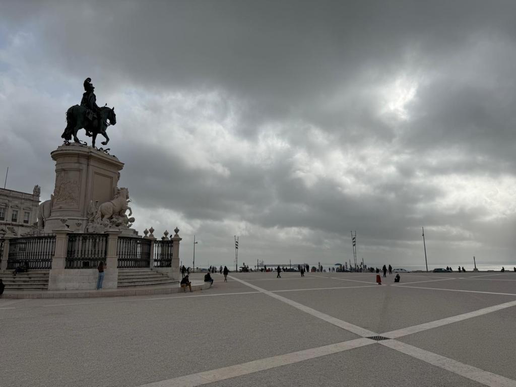 Aangekomen op het Praça do Comércio ziet het er mooi uit, dat moet gezegd worden. Het weer is qua temperatuur goed, rond de 20 graden, maar het is bewolkt en een soort van mistig (geen smog). Het vrijheidsbeeld van Lissabon, de Cruz Alta, aan de overkant van de Tagus rivier, is slechts gedeeltelijk waarneembaar. Het plein is wijds van opzet en voorziet is een groot aantal restaurants en lijkt een toeristisch centrum. Het bevat zelfs een bier-museum. Er staan een grote hoeveelheid oude trams, tuk-tuks (gemotoriseerde riksja), oude oldtimers met elektrische aandrijving en taxi’s om je daar te brengen waar je naar toe wil en ze bieden een groot scala aan toeristische routes aan door de stad. Allemaal staan ze met folders te springen om je aandacht.