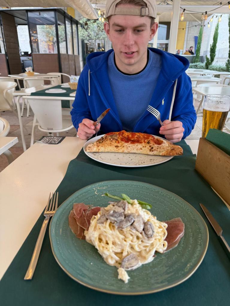 We besluiten om eerst eens even ergens te gaan eten en Nick kiest, het is immers zijn dag, voor de Italiaan: mijnheer wil pizza. Prima, dan wordt het pizza! Nick besteld een Calzone (dubbelgevouwen pizza) en ik een Pasta al Forno. Prima te doen!