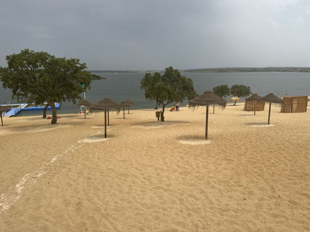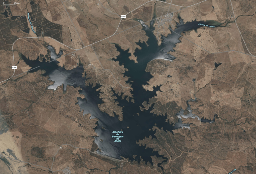 In onze achtertuin, letterlijk op 1 km afstand, is er ook een groot stuwmeer, het “Albufeira da Barragem do Alvito” stuwmeer. Dit stuwmeer is gelegen in het hydrografische bekken van de rivier de Sado, in de loop van de rivier Ribeira de Odivelas. Nog ongerept en met uitzicht over het prachtige weidegebied rondom is het een aangename plek om te vertoeven. Aan dit stuwmeer is zelfs een heus strand aangelegd met een soort van camping er omheen, vooral geschikt voor campers. Toerisme naar dit soort stuwmeren is een groeimarkt, aangezien de Algarve redelijk “vol” zit…