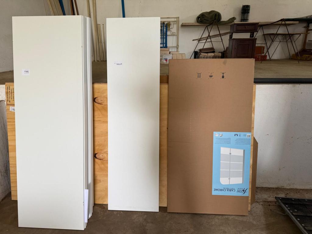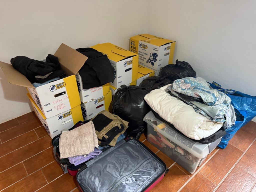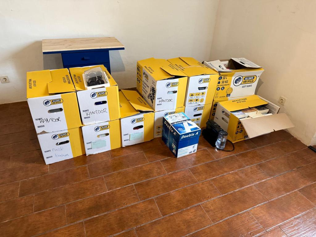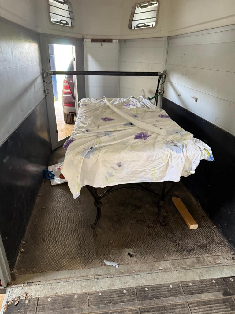 Daarna de belangrijkste spullen naar binnen (spullen uit de koelbox naar de koelkast en de spullen voor het bed) en dat in orde maken, vervolgens de rest uitladen en alles wat bij elkaar hoort ook bij elkaar zetten en de spullen voor het huis gelijk de goed kamer in! Er gaat toch altijd meer in zo’n paardentrailer als je denkt! Door de rit waren spullen toch wat gaan schuiven waardoor we de vrees hadden dat mogelijk de badwand het begeven had. Toen ik de doos eruit had hoorde ik geen glasgerinkel dus dat lijkt wel goed te zitten!