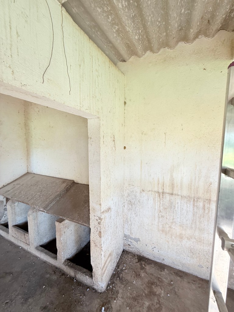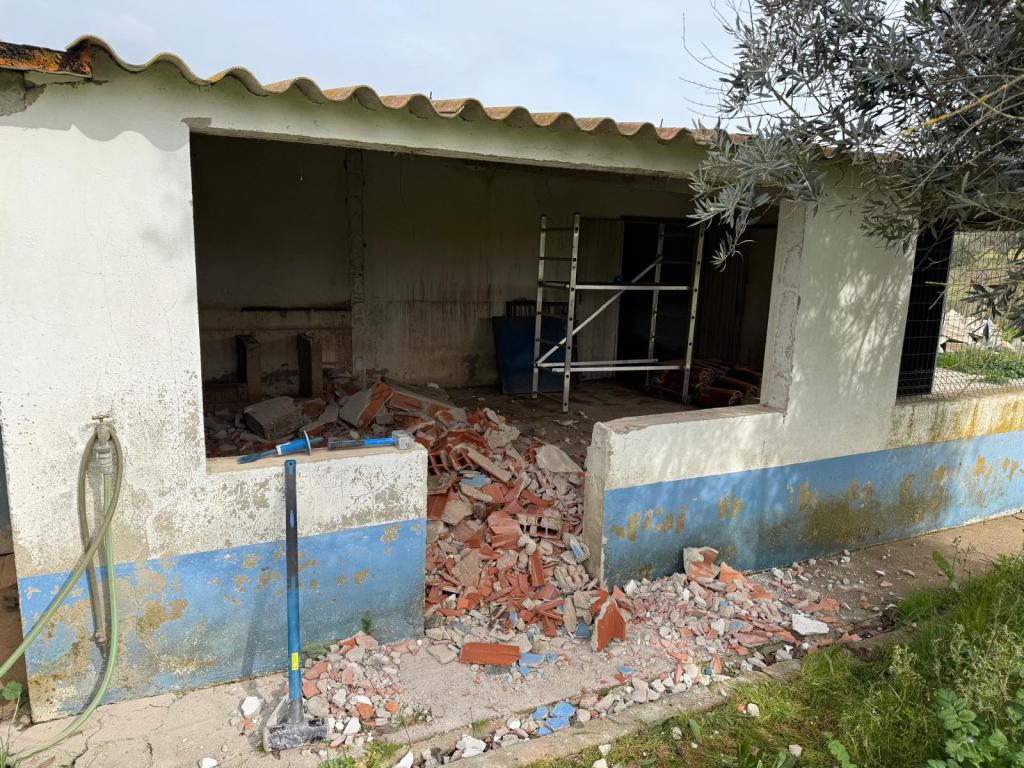 Om voor vrijdag alles zo ver klaar te hebben ga ik gelijk aan de slag met het sloopwerk. Het is fysiek een lekker klusje maar het gaat gestaag. De binnenmuur ligt vrij snel omver en daarna wordt een oude opening in de buitenmuur in ere hersteld. Tot slot worden een paar betonnen broedhokken gesloopt. Zo ontstaat er een ruimte waar straks 2 paardenboxen van 5 bij 4 meter gehuisvest worden. Colette wil het beste voor haar paarden en een ruime box hoort daarbij: als minimum geldt 3 bij 3 meter maar dan kunnen ze niet lekker liggen zonder dat ze tegen een muur aankomen of iets dergelijks. We hebben hier de ruimte dus we maken er dan ook gebruik van!