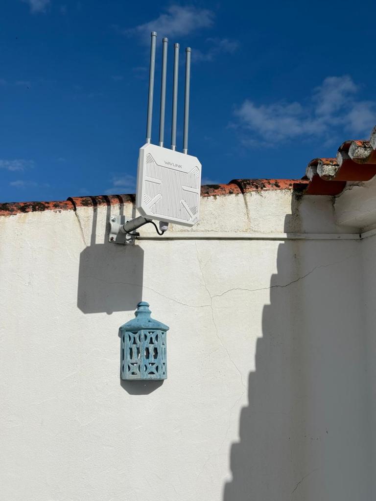 Mooi moment om de WiFi-installatie voor buiten op te hangen. Ik demonteer eerst de oude schotel-ontvanger. Ik heb geprobeerd om aan deze beugel een pijp te bevestigen zodat de zender hoger zou komen te hangen echter dit is niet stabiel en ik heb geen materiaal voor handen om dit anders op te hangen. Voor nu dus maar even aan de beugel van de oude schotelinstallatie. Ik gebruik de bestaande kabelgoot om de UTP kabel netjes weg te werken en breng de kabel door het bestaande gat in de muur naar binnen en sluit het aan op de PoE-verdeler (Power over Ethernet). Het groene lampje bij de UTP kabel in het apparaat gaat gelijk branden en geeft signaal op de WiFi! Mooi, morgen komt de Vodafone WiFi-ontvanger met Ethernet-poorten binnen en kan ik de installatie afmaken.