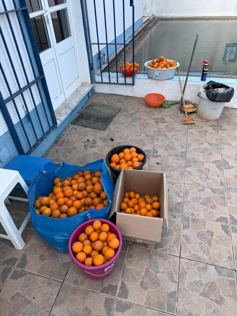 De dames gebruiken de ochtend vooral voor het verzamelen en persen van de sinaasappels. Aangezien het hier zo stil is valt het “kabaal” van het tweetal wel op: de hele tijd wordt er gekletst! En in de zon gezeten natuurlijk… Maar goed: de lading sinaasappels is behoorlijk, we hebben nog geen idee wat we hiermee aan moeten… Een gedeelte wordt in ieder geval geperst waarmee we in de eigen behoefte kunnen voorzien. Waarschijnlijk zullen we een gedeelte neerzetten bij het vuilstortpunt in het dorp zodat mensen ze mee kunnen nemen naar behoefte en wellicht willen Elly en Manuel & Maria nog iets hebben.