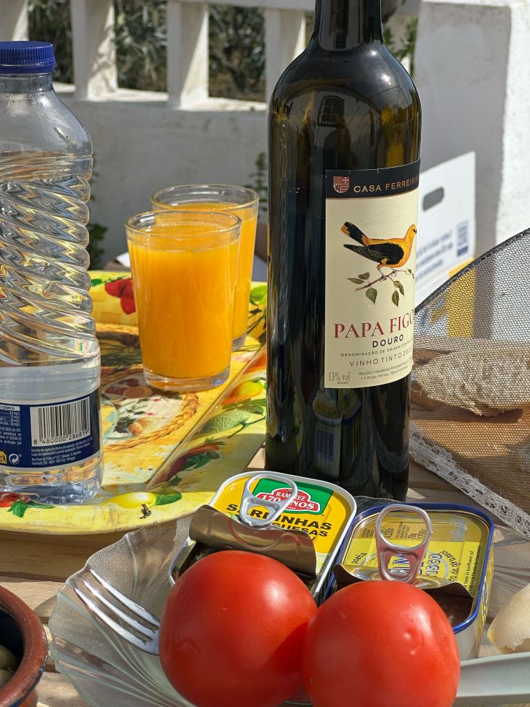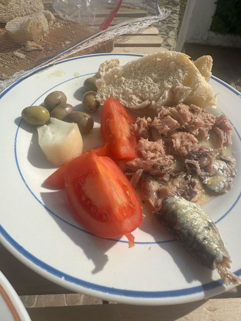 Om circa 13:00 uur weer een heerlijke lunch buiten in het zonnetje. Voor mij een lekkere tosti met Chorizo en de dames hebben Portugese sardientjes en tonijn meegenomen met stokbrood. Uiteraard mogen een wijntje en sinaasappelsap van eigen kwekerij niet ontbreken!