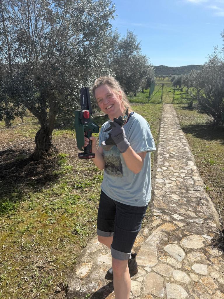 Na de koffie gaat Janneke aan de slag om de vijgebomen te ontdoen van nieuwe scheuten die onderaan de bomen groeien. Zoals je kunt zien is ze er helemaal klaar voor! Zoals ze zelf zegt wordt ze hier continu “aangevallen door de natuur”… Colette gaat verder met het leggen van de druppelleiding rond de bomen en ik plaats de T-stukken voor de druppelleiding als aftakking op de 25mm tyleenbuis bij de bomen. We werken zo even gefocust verder tot de lunch. Qua aanleg van het beregenings-systeem zitten we nu op circa 75%. Morgen de laatste stukjes van de puzzel en dan testen of alles goed werkt!