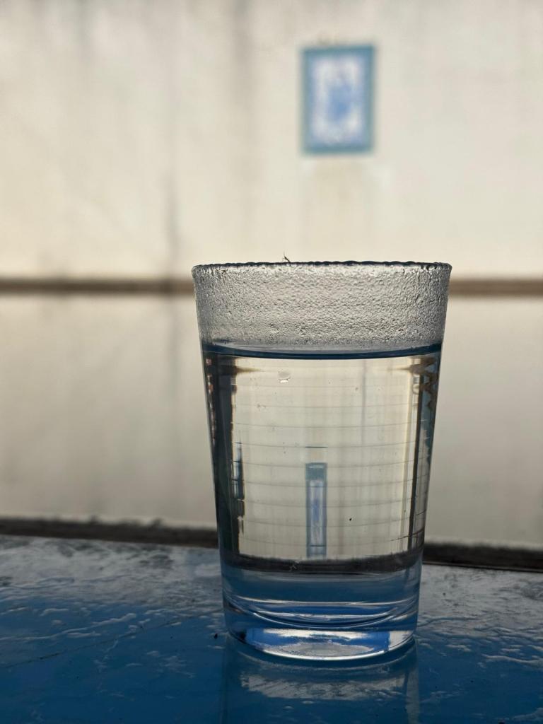 Na het ontbijt ga ik weer verder met de aanleg van de druppelleiding, de dames gaan even boodschappen doen. Allereerst een check: 3 dagen geleden hebben we het waterbassin bij het huis aangevuld vanuit de waterput en toen heb ik een glas water afgetapt en laten staan. Ook na 3 dagen ziet het er nog kraakhelder uit! Hier kunnen we dus prima het zwembad mee gaan vullen straks als die eenmaal staat! Vandaag begint verder met het strak maken van de druivenranken achterin de boomgaard: met de bosmaaier maak ik de grond vrij zodat alleen de druivenranken er nog staan.