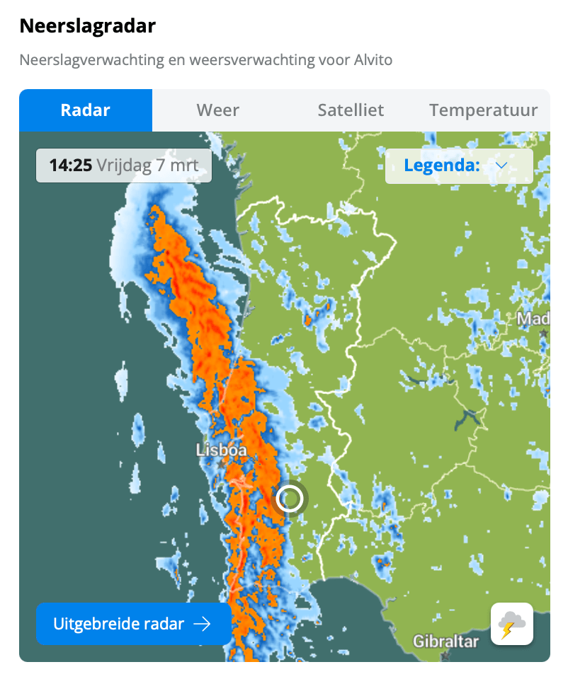 Waar we vorig jaar rond deze tijd in Portugal extreme temperaturen van rond de 30 graden beleefden is het nu 180 graden omgedraaid: het is extreem nat voor Portugese begrippen! Zie hiernaast de regengrafiek van vrijdag 7 maart toen het met bakken uit de hemel kwam. Een dergelijk natte periode heeft men sinds jaren niet meer gekend omstreeks deze tijd van het jaar. Wel goed voor het stuwmeer, dat zal straks goed gevuld zijn en een meer dan voldoende buffer zijn voor de zomer.
