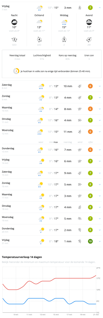 Ook de komende 2 weken wordt er bijna iedere dag wel neerslag verwacht, terwijl de langjarig gemiddelde klimaat-statistieken in februari en maart een gemiddelde van 5 regendagen per maand afgeeft komt het straks op het 3-voudige uit qua aantal regendagen. Qua hoeveelheid neerslag laat het langjarige gemiddelde een hoeveelheid zien van tussen de 31 en 60 mm, daar zullen we hoogstwaarschijnlijk ook ruim overheen gaan!
