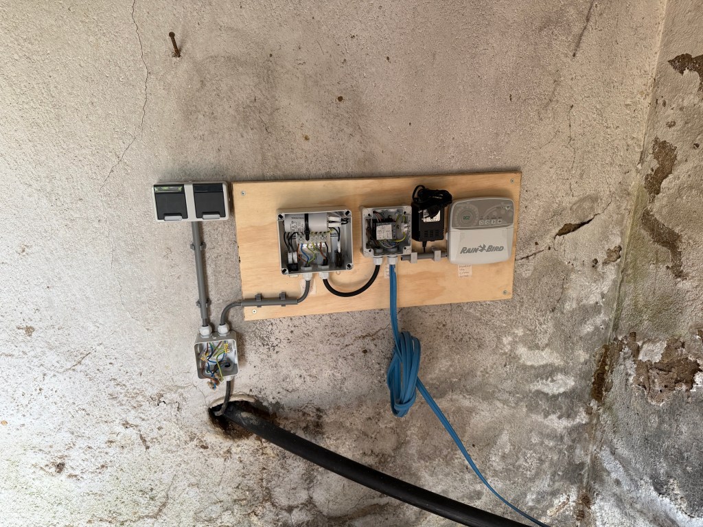 De aannemer zorgt er voor dat er een sleuf getrokken is van de voordeur van de woning naast de loods naar de dierverblijven. Hierin zal een zware uitvoering van een grondkabel op circa 40cm diepte worden gelegd. De afstand is circa 30-35 meter, dus met de reeds eerder meegebrachte grondkabel van 50 meter gaat dat prima lukken! Bij de dierverblijven zal de kabel worden afgemonteerd in een lasdoos vanwaar we verder kunnen doorlussen. Bij de woning naast de loods bevindt zich binnen naast de voordeur de groepenkast. We zullen daar een extra groep aanbrengen waar de kabel voor de dierverblijven netjes afgemonteerd kan worden. Circa een dag werk.