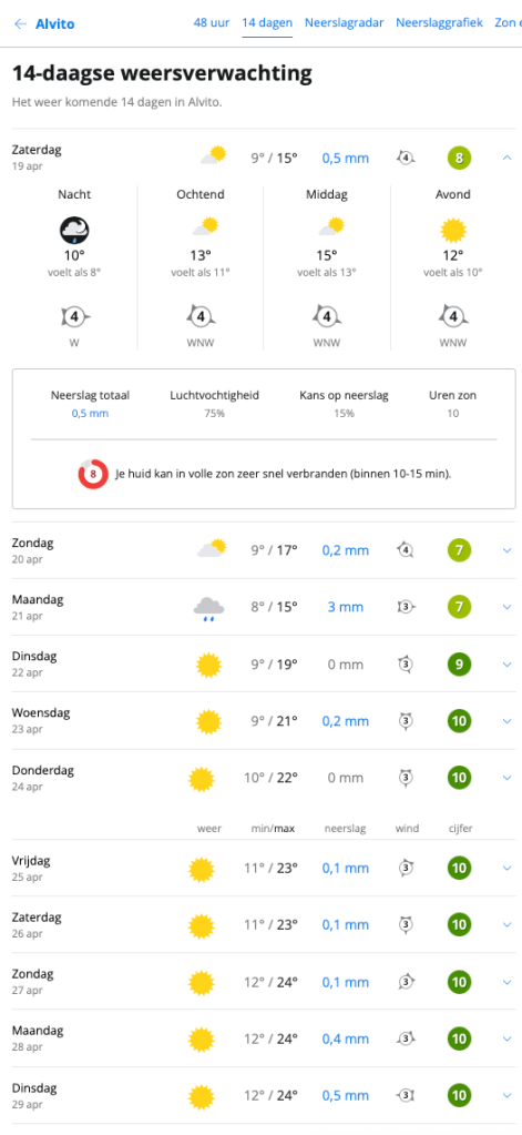 Echter, de dagen daarna wordt het zonniger en warmer! Vanaf woensdag krijgt iedere dag qua weer het cijfer 10: Bom Homem (Lekker man!)!