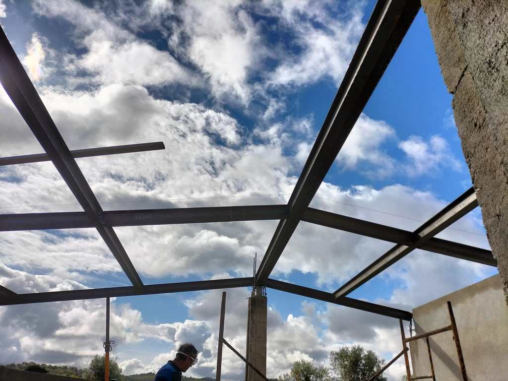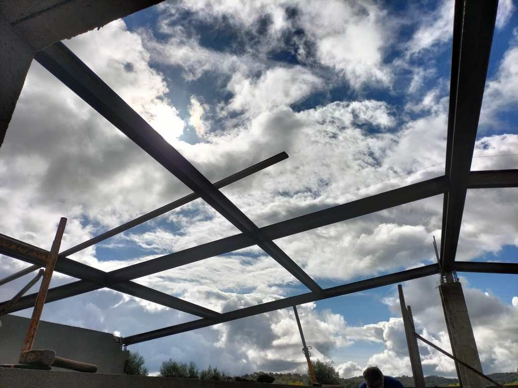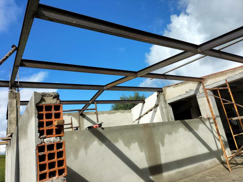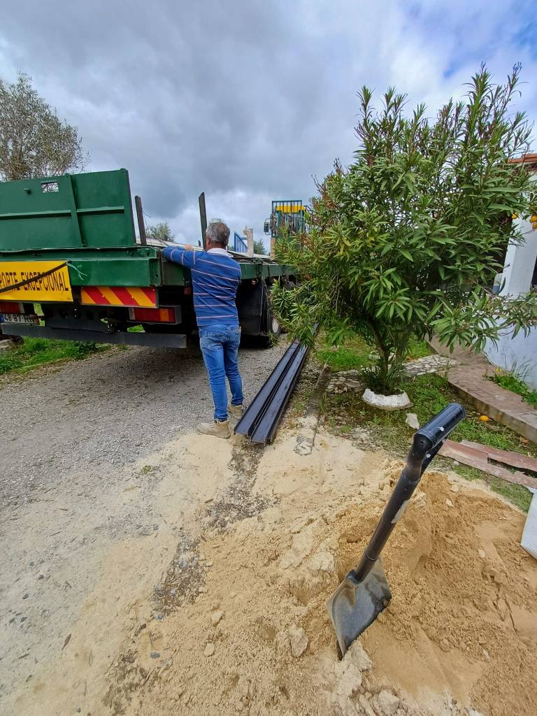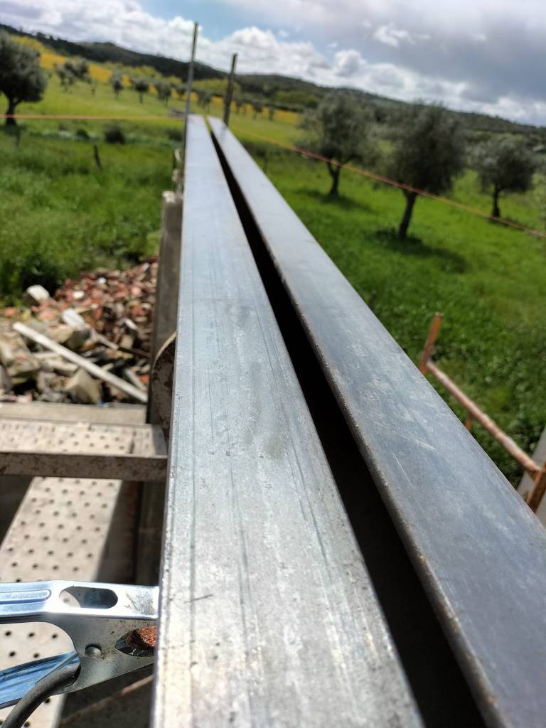 Op maandag zijn de stalen balken voor het dak bezorgd. Hiermee kan de constructie af gemaakt worden zodat daarna de dakdelen geplaatst kunnen worden. De vrachtwagen had nogal wat moeite om vanaf de smalle weg onze poort in te draaien, maar dat is uiteindelijk toch gelukt. Het lossen van de stalen delen was daarna een fluitje van een cent!