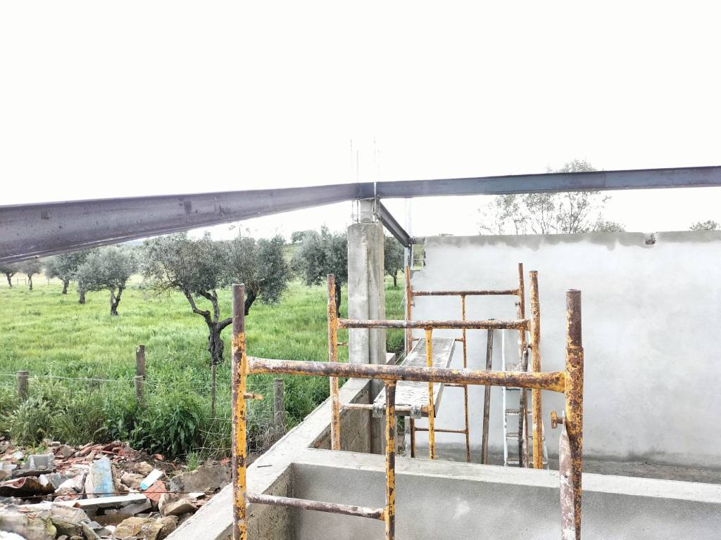 Goed zichtbaar is nu hoe het dak staat ten opzichte van de stallen er onder en hoe ruim en open de stallen zijn. Goed te zien is ook hoe de dwarsligger in het midden verankerd is aan de staalconstructie in de pilaar. Als straks de staalconstructie gereed is kunnen de draagpunten voorzien worden van extra beton om het geheel te ondersteunen.