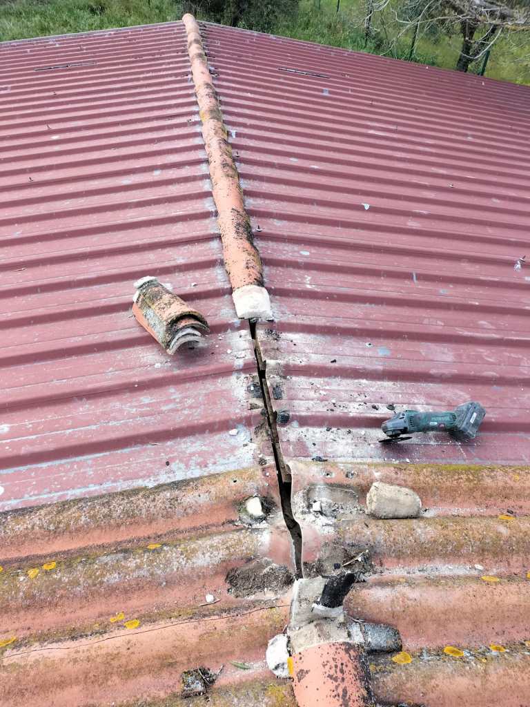 Zie rechts op de foto op de grond ook de herbruikbare nokdelen die van het dak zijn gekomen. Dat is ook typisch Portugees: alles wat herbruikbaar is wordt netjes opgeslagen. Grondstoffen zijn duur en geld is schaars, dus alles wordt gebruikt wat voor handen is. Dit soort onderdelen kunnen straks prima herbruikt worden als er ergens een overkapping of een dakje geplaatst moet worden. ook worden dit soort nokdelen in omgekeerde vorm gebruikt om water naar bepaalde plaatsen te leiden: met de hoogteverschillen in Portugal kan dat handig zijn.
