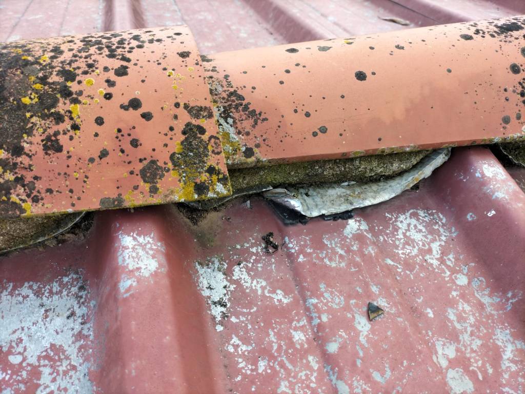 Het huidige dak bestaat uit 2 delen: aan de voorkant is het dak voorzien van 5cm geïsoleerde aluminium dakplaten terwijl de achterkant is voorzien van traditionele golfplaten (asbestvrij). Helaas is de nokafwerking dan weer half-half uitgevoerd: normaal gesproken is de nokafwerking voor de aluminium dakplaten ook met bijbehorende aluminium nokdelen uitgevoerd, echter de nok is uitgevoerd in gemetselde nokdelen, ook op de aluminium platen. Zie op de foto ook de folie die gebruikt is om de specie niet direct op het aluminium aan te brengen. Door de verschillende werkingen van de materialen met onder andere temperatuurwisselingen ontstaan hier openingen waar gemakkelijk vocht door kan sijpelen.