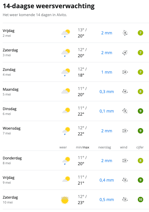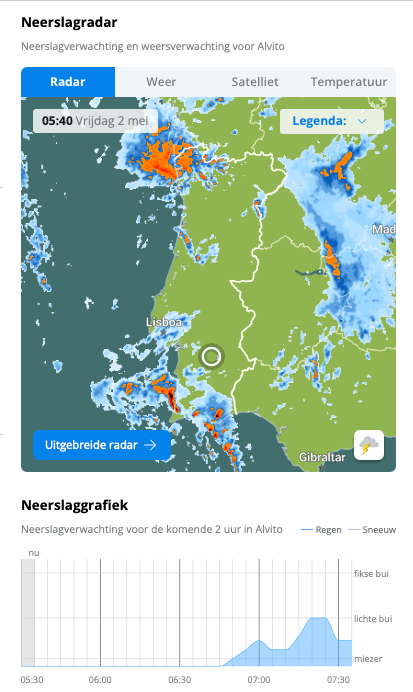 Rond 7 uur gaat het op vrijdag 2 mei regenen. Dit in tegenstelling tot hier in Nederland: een stralend blauwe lucht met een temperatuur die dan al rond de 15 graden ligt.