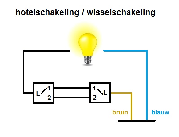 Ik moest toch weer even zoeken hoe dat ook al weer in zijn werk ging, was alweer een tijdje geleden en deze amateur-electriciën had dat even niet meer paraat. De fase-draad op de 1e schakelaar, 2 draden tussen de schakelaars, en op de 2e schakelaar gaat de draad dan naar de lamp. Precies zo aangelegd en het werkte in 1 keer! Nog geen stop er uit geslagen!
