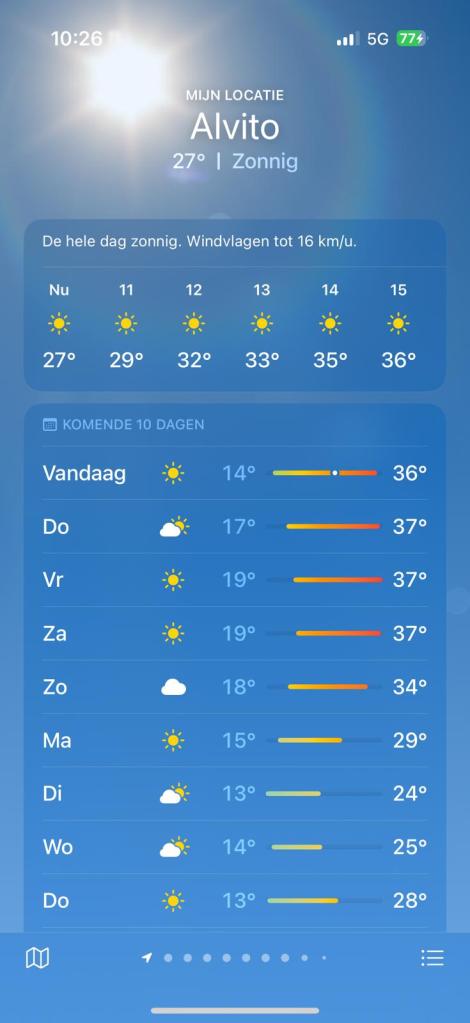 Daar waar het in Nederland kletsnat is schijnt hier volop de zon, en hoe! De komende dagen staan volgens Pedro Timofeeff temperaturen van ruim 35 graden op het programma! Goed nat houden de boel!