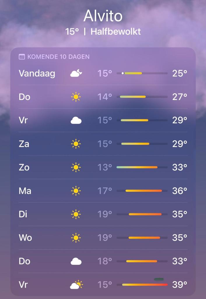 De hele week is het lekker warm geweest in Alvito met temperaturen richting de 30 graden of daar overheen. De komende week wordt dat alleen maar warmer met temperaturen oplopend naar 39 graden.