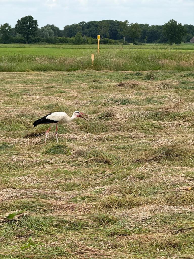 Gedurende het maaien zie je regelmatig wat veldmuisjes wegspringen, dat werd ook opgemerkt: ik kreeg bezoek van een ooievaar die het pas gemaaide gras langsliep op zoek naar wat eten…