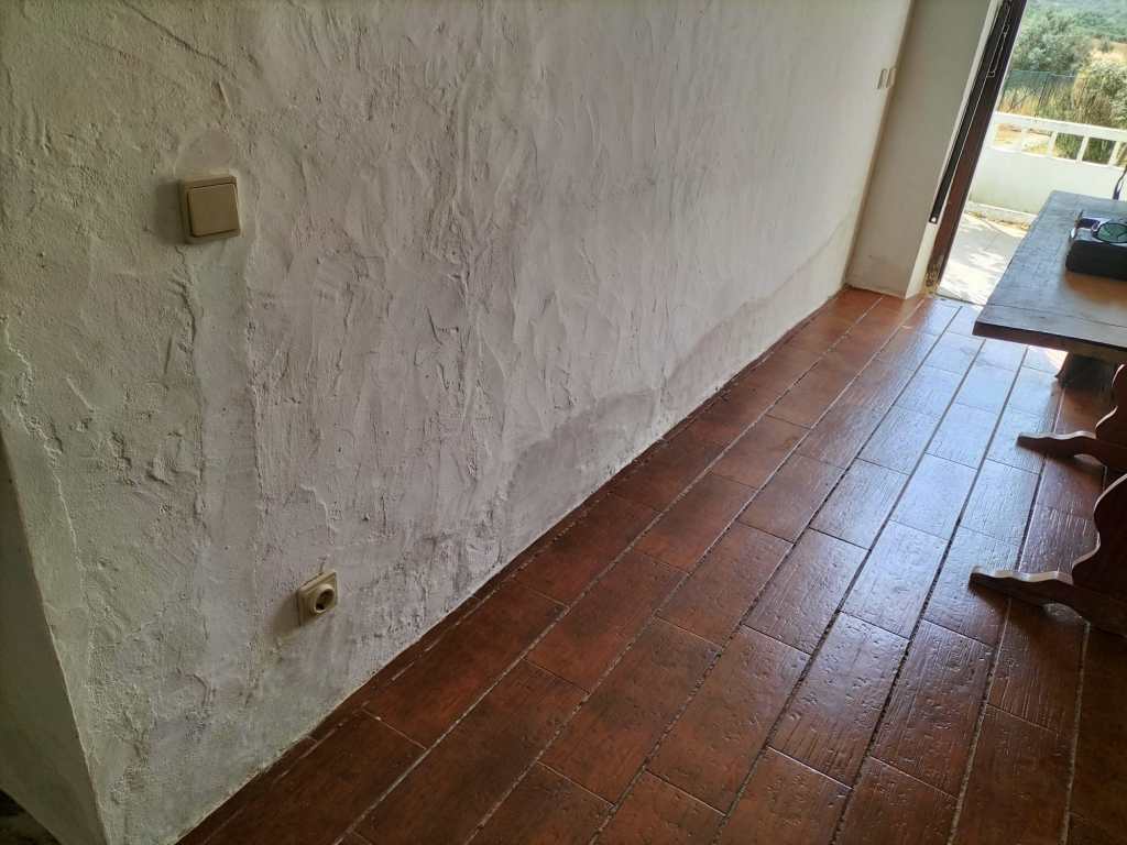 Vorige week is het pleisterwerk van de muren gehaald daar waar het broos was. Intussen zijn de muren voldoende gedroogd dat ze weer afgewerkt kunnen worden. Ook dit is weer snel en netjes gedaan: de muren kunnen geverfd worden!