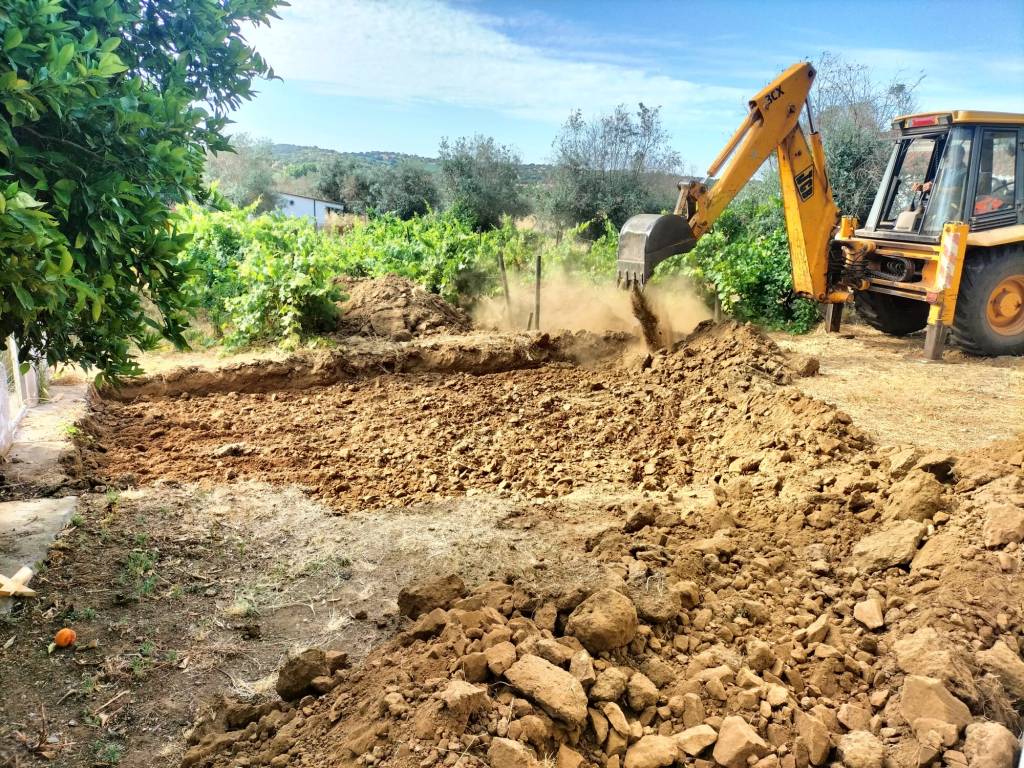 De aannemer is inmiddels begonnen met het graafwerk voor de uitbreiding van de volière. Daar waar een betonnen vloer moet komen wordt de grond met een kraan weggehaald zodat er voldoende ruimte ontstaat om straks de betonnen vloer te kunnen storten.