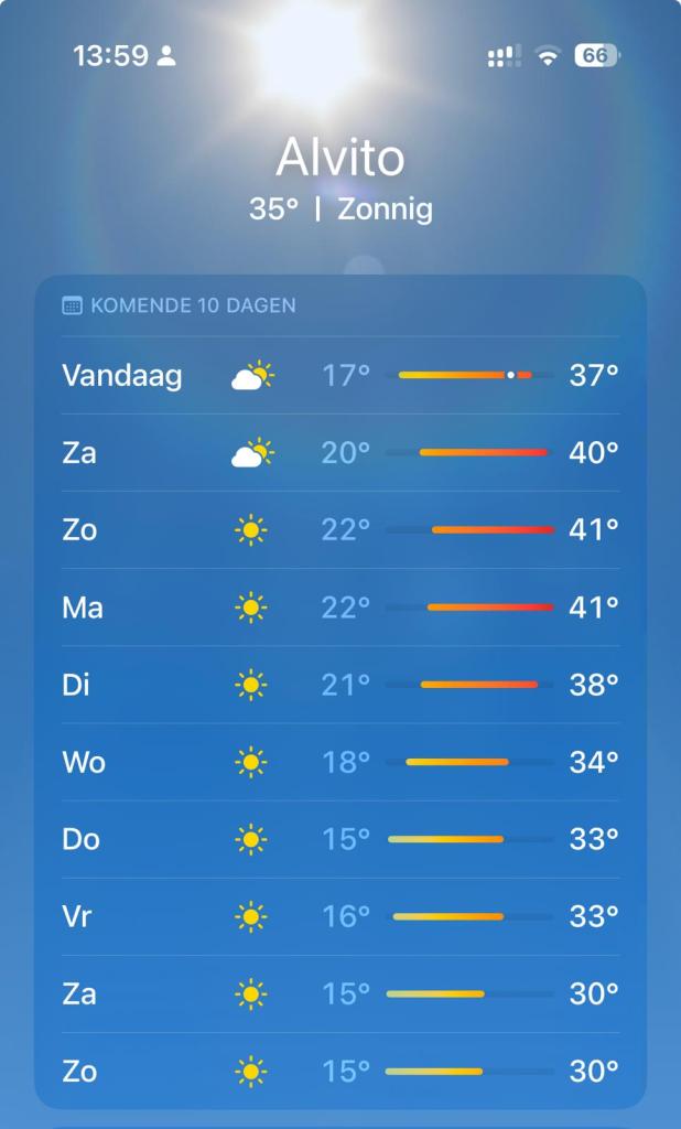 In het komend weekend temperaturen boven de 40 graden (!) en de rest van de week ook ruim boven de 30. Dit terwijl het in de Algarve “slechts” 30 graden wordt dit weekend.