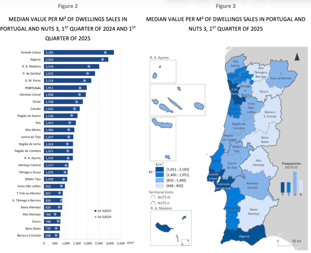Het Portugese Centraal Bureaus voor de Statistiek, het Instituto National de Estatística, heeft een publicatie vrijgegeven waarin de statistieken verder worden toegelicht. De donkerblauwe regio’s zijn de duurste regio’s: hier onder vallen zoals te verwachten de regio’s Porto, Lissabon, Madeira en de Algarve. Hier worden de meeste woningen verkocht tegen de hoogste prijzen.