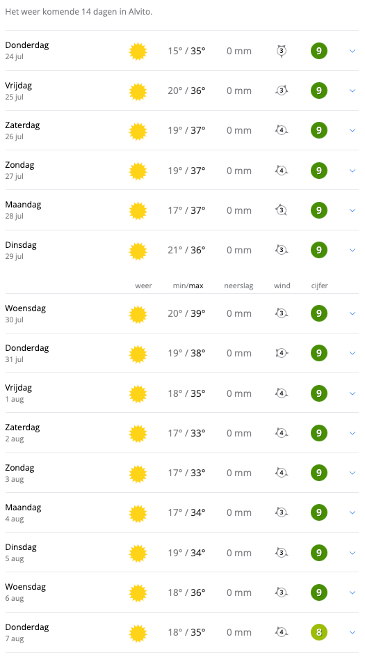 Je lijkt er de klok op gelijk te kunnen zetten: ook de komende 2 weken warm, droog en zonnig met zonder uitzondering temperaturen tussen de 34 en 39 graden.