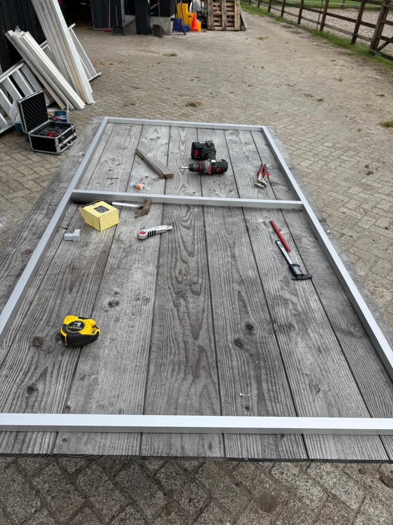 Om in Portugal niet teveel tijd te verliezen wil ik het gros van de standaard volièredelen hier in Nederland vast in elkaar zetten, dan hoef ik op de boerderij in Portugal alleen de delen te plaatsen en de passtukken op maat te maken. Ik zal een plan maken hoe de volière opgebouwd gaat worden waarin ook duidelijk de volgorde van het plaatsen van de onderdelen zal worden opgenomen. Die volgorde kan er voor zorgen dat de passtukken beperkt blijven en je niet op meerdere plekken moet gaan “compenseren” omdat je een fout hebt gemaakt ergens en aan het uiteinde een volledige plaat straks net niet past en je een paar centimeter tekort komt…. Meten is weten!