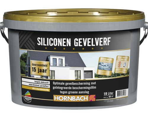 De gevelverf wordt de Hornbach Siliconen Gevelverf in verpakking van 10 liter. Deze gaat 15 jaar mee en heeft door de siliconen structuur een vuil- en waterafstotende werking. Het is een matte verf op waterbasis met een verbruik van 6 m2 per liter verf. Er waren 9 stuks op voorraad en die hebben we besteld.