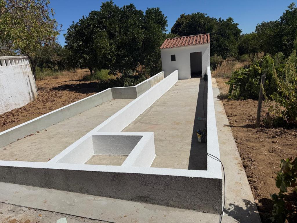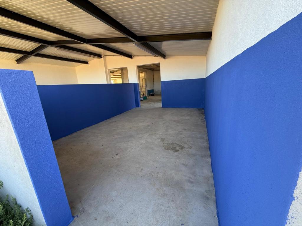 De 4e dag begon met een fraai ochtendzonnetje en 16 graden oplopend naar een 32 graden begin van de middag.De planning daarop gemaakt van vandaag: ’s ochtends schilderen van de betonnen fundering van de volière en ’s middags de stallen in. Wat een beetje verf niet kan doen!