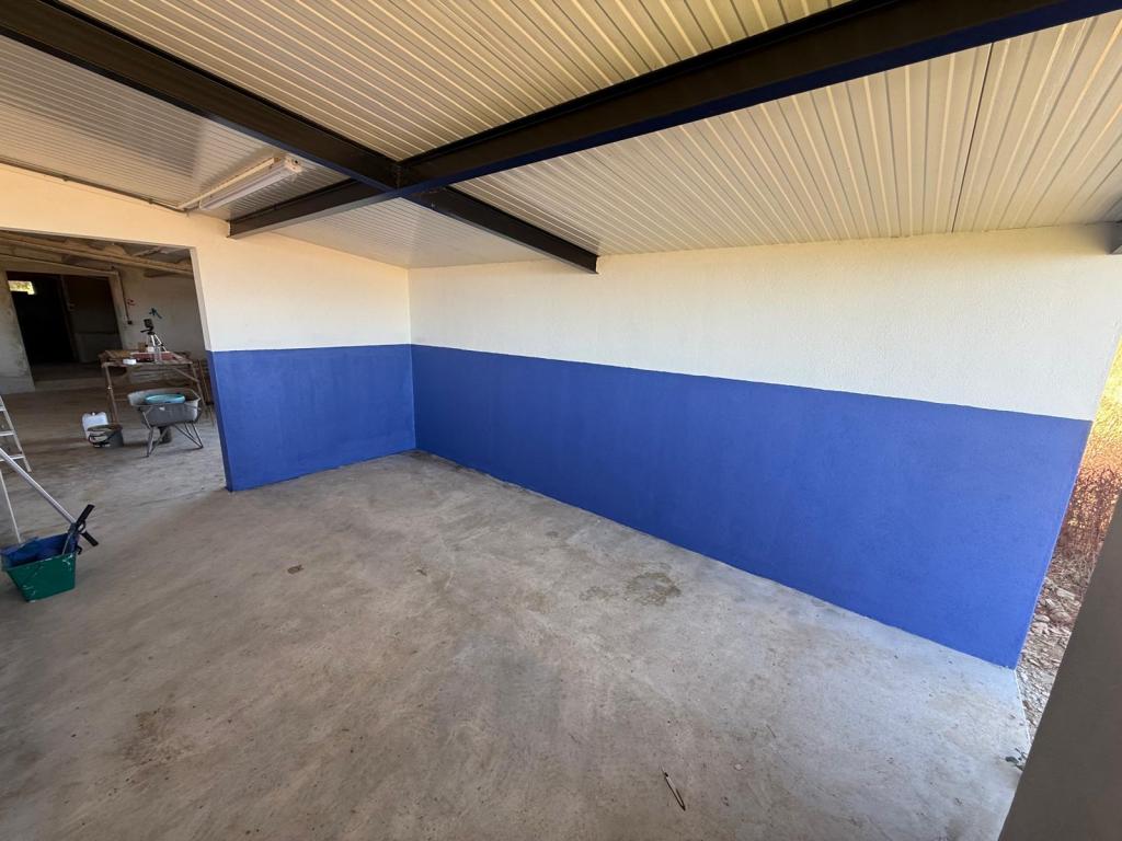 De stallen krijgen 2 kleuren: Wit en Portugees blauw. De blauwe kleur wordt als trasrand gebruikt: meestal de eerste ca. 40 cm van de grond gerekend en soms ook rondom ramen en deuren. We kiezen er hier voor om de trasrand hoger aan te houden, op 120 cm. Dit is ook de hoogte van de muurtjes in de stallen en de hoogte van de staldeuren. In de stallen poepen de paarden nogal eens “van zich af” (als je nu denkt “dat doe ik thuis ook”: dat is niet normaal! ) en dat is op wit nu eenmaal beter zichtbaar dan op een donkere kleur.