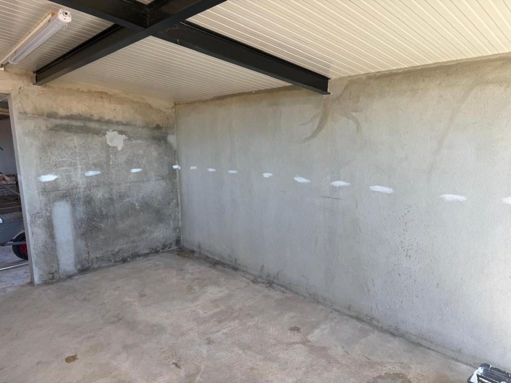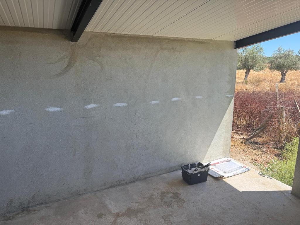 De stippellijn helpt om de hoogte aan te houden. Met de kwast brengen we een laag verf aan tegen de dakrand en dan met de roller tot aan de stippellijn. Dat gaat best snel! Vooral bij de achterwand met de twee ingangen naast elkaar zal het verschil maken. Op deze achterwand is oud stucwerk gecombineerd met aangesmeerd beton voor het vullen van de gaten. De diepgrond moet er voor zorgen dat de zuigende werking van de muur wordt opgeheven en dat de latex goed “pakt”.