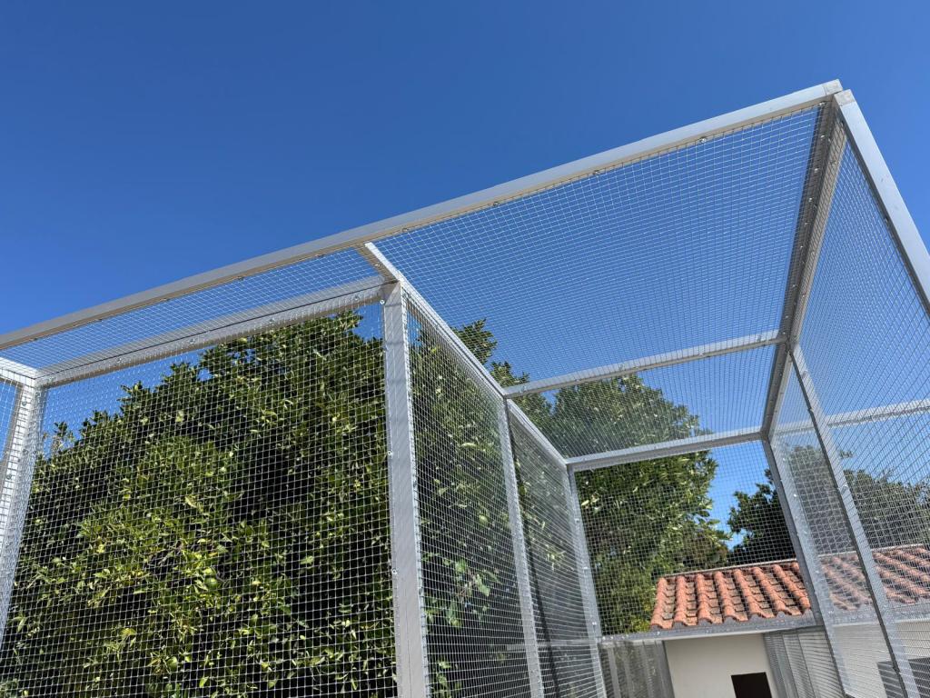 Het deel voor de tropenvogels is nu klaar. Met wat rachelhout fixeer ik de bovenkant en aan de voorkant fixeren we met een kruis van rachelhout de volière zodat deze waterpas staat en bij slecht weer niet gaat “zwabberen”…