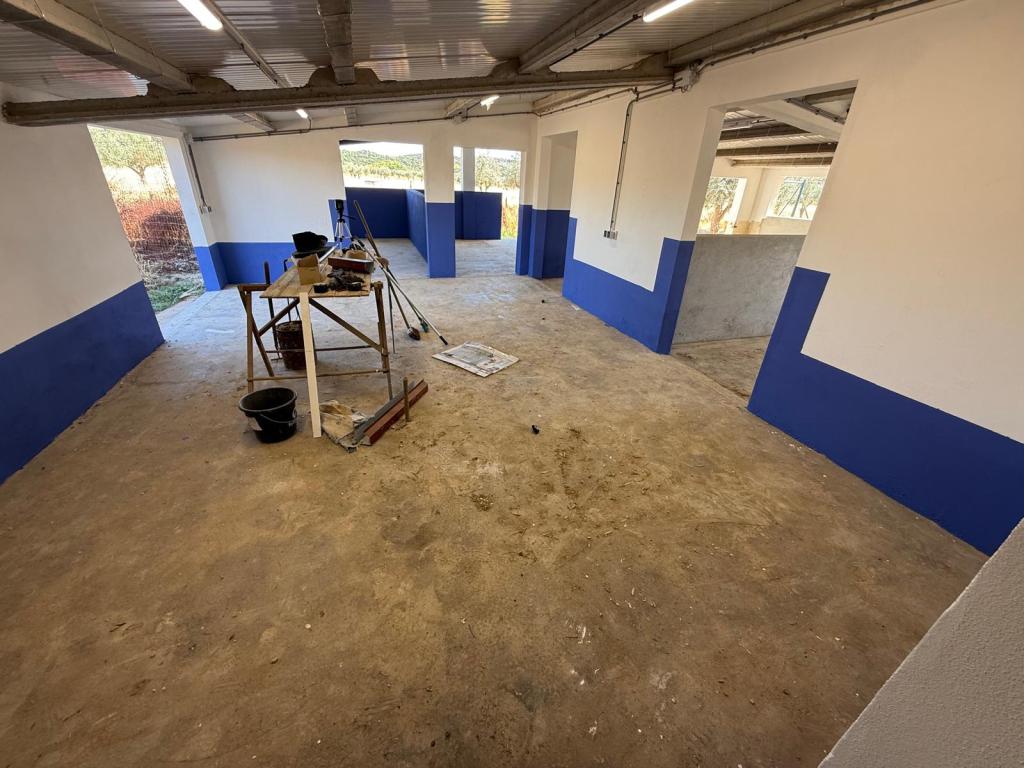 Voor de stallen was het plan dat het gedeelte voor de paarden in de verf zou zitten. Dat is gelukt op 1 muur na: het blijkt dat na het drogen van de afwerklaag van het beton dat deze laag is losgekomen van de grond. Dat komt hoogstwaarschijnlijk door de warmte op het moment van het aanbrengen. Voor de ene muur waarvoor dat is gebeurd zal de aannemer het herstellen door de naad wat uit te hakken en te voorzien van nieuw beton. Als dit hersteld is kunnen we de volgende keer deze muur ook verven.