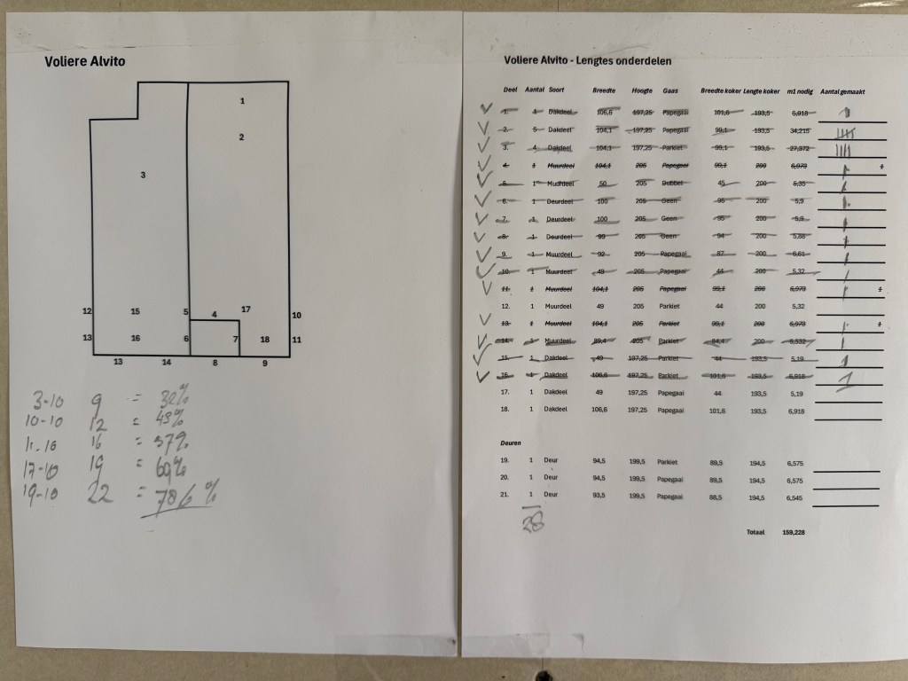 De vorderingen met de volière gaan gestaag: na de zondag zitten we op bijna 80%: nog 6 deeltjes te gaan! Alle delen hebben we netjes genummerd zodat het straks in Alvito ook weer gemakkelijk in elkaar te zetten is. Qua onderdelen hebben we vooralsnog van alles genoeg! Dit gaan we zeker op tijd af hebben!