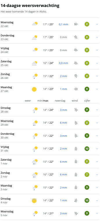 Zoals de voorspellingen er uit zien is er een grotere kans op regen de komende week in Alvito: dat betekent dat de oogst van de olijven dichterbij komt! Na de zomer zijn de olijven “rijp” voor de oogst, maar de olijven worden pas goed als er een periode van regen overheen is gegaan: de olijven “zuigen” zich dan vol met vocht en hierdoor wordt de kwaliteit van de olijven beter! We zijn zeer benieuwd!