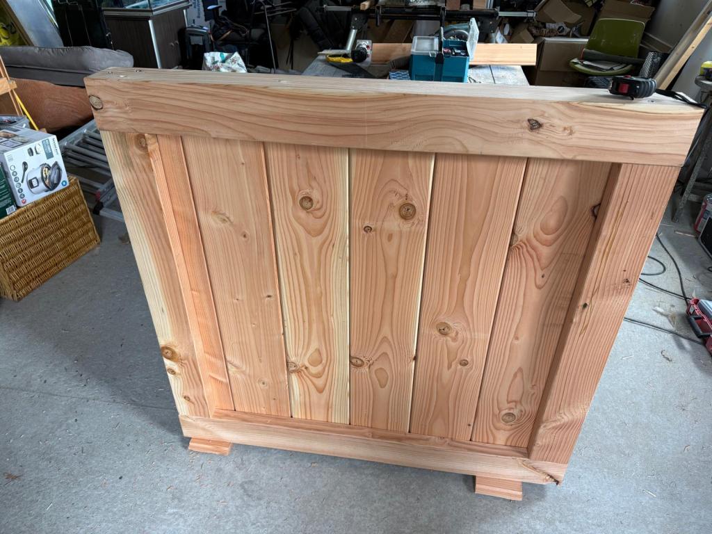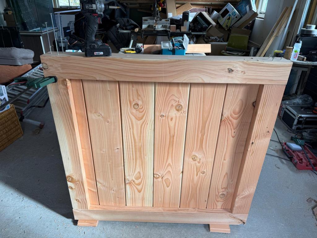 Nadat de balken gefreesd zijn monteren we het onderstuk op een zijstuk zodat daarna de veilingdelen er tussen geplaatst kunnen worden en daarna plaatsen we het andere zijstuk. Tenslotte plaatsen we het bovenstuk er op en zetten het geheel met schroeven van 20cm goed vast. Dit is een stevig deurtje van een kilo of 30!!