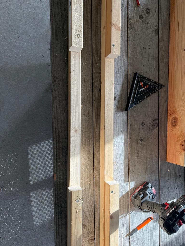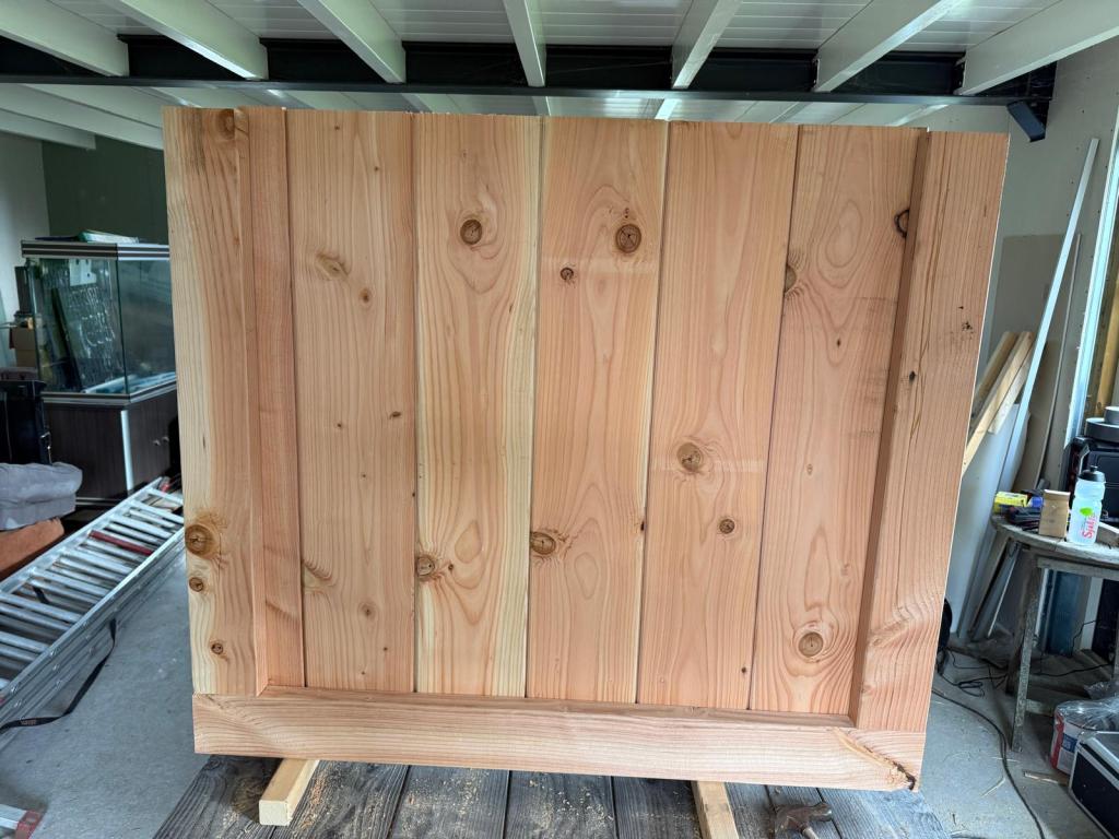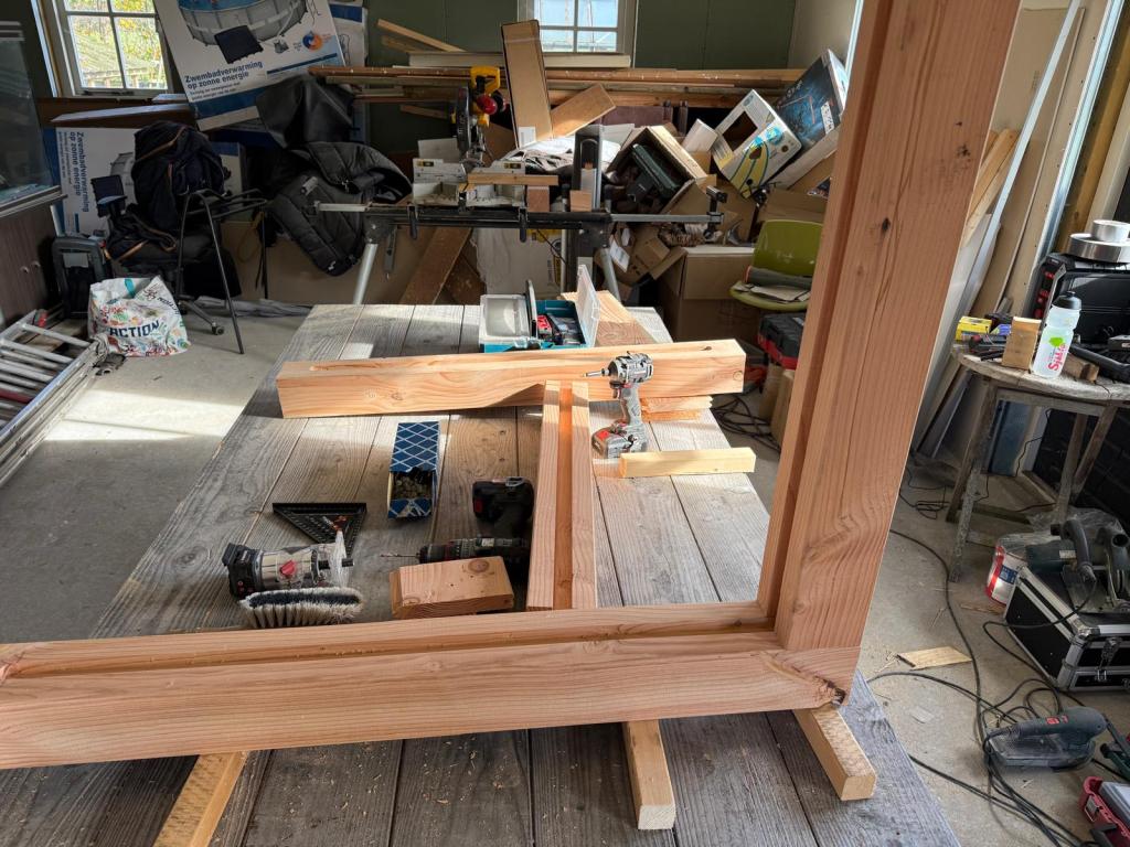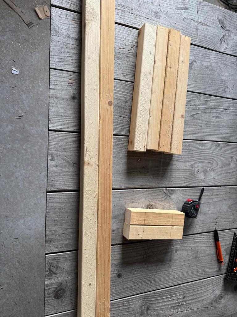 Nadat we vorige week het hout voor de staldeuren hebben opgehaald en afgelopen week de laatste volièredelen in elkaar hebben gezet kunnen we beginnen met de staldeuren. We maken de staldeuren 118cm breed bij 112 cm hoog. We moeten echter beginnen met het maken van een mal voor het freeswerk te vergemakkelijken.