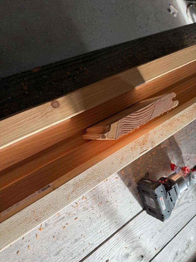 Als de mal gereed is testen we ‘m eerst op een eerste balk. We freezen een diepte van 20mm in 4 keer. Met een passtukje testen we bij iedere freesdiepte of het passtukje nog in de gefreesde sleuf past. Eigenlijk gaat het in 1 keer goed!