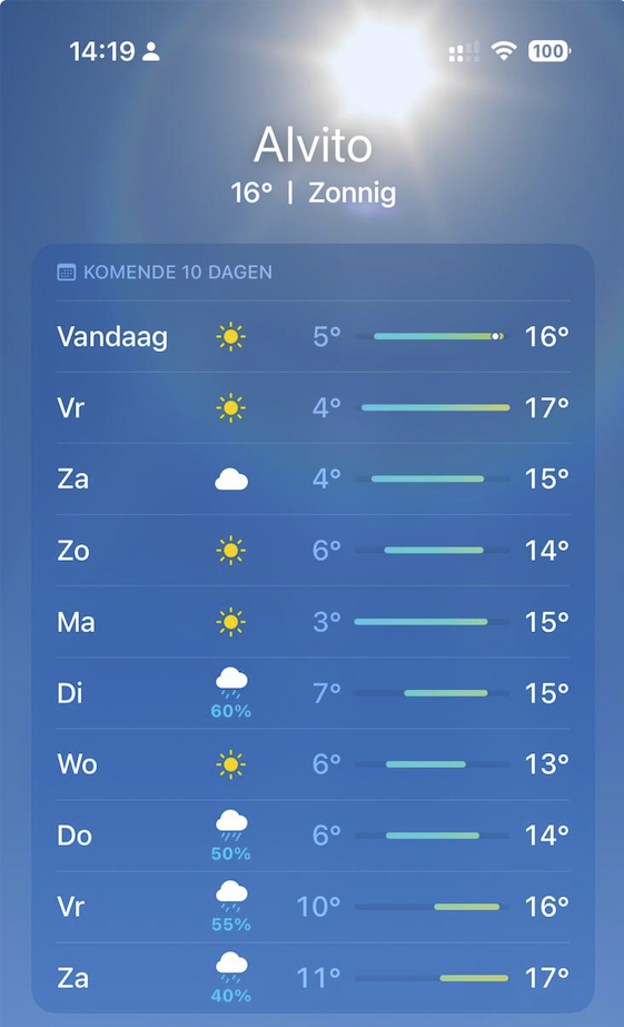 Deze week in “Het schuifje van Janneke”, ofwel in traditioneel Portugees “O controle deslizante de Janneke”, leggen we het weerbeeld van Alvito weer naast dat van hier in het koude en natte Nederland. Deze week zijn er wat andere verschillen in het weer waar te nemen dan normaal: in Nederland veel regen en lage temperaturen, in Alvito droog, zonnig en dagelijks ca. 10 graden warmer dan hier!