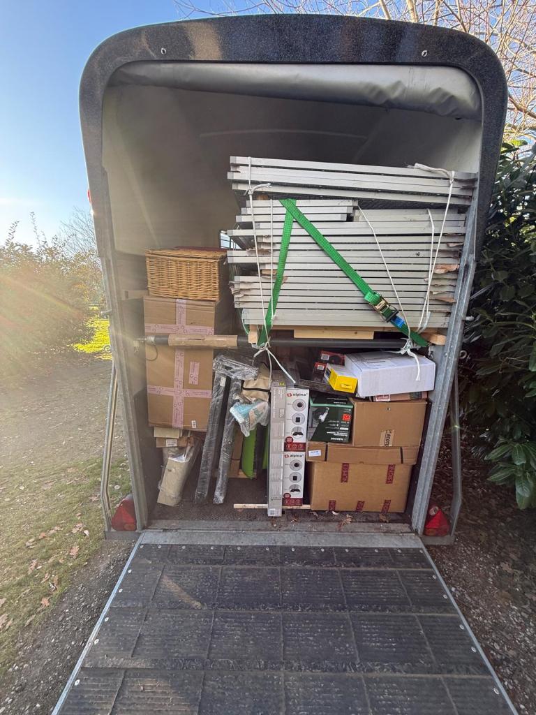 Nadat de “spullen van omvang” in de trailer zijn geplaatst gaan we verder met het vakkundig “volbouwen” van de trailer zodanig dat alles “vast” komt te zitten. Krimpfolie helpt om losse spullen bij elkaar te houden en te beschermen tegenbeschadigingen. De zware onderdelen komen op de vloer van de trailer, de lichte spullen hoger. Zo staat er op de vloer een compleet 2-persoonsbed en komt het matras straks op de volièredelen te liggen. Ook alle dozen met spullen worden naast de staldeuren op de vloer onder de volièredelen geplaatst zodat alles lekker dicht gebouwd is. Voorin komen straks nog andere zware spullen, zoals de verfemmers en zaagtafel ed. die nog mee gaan. Volgende week vullen we de boel af!