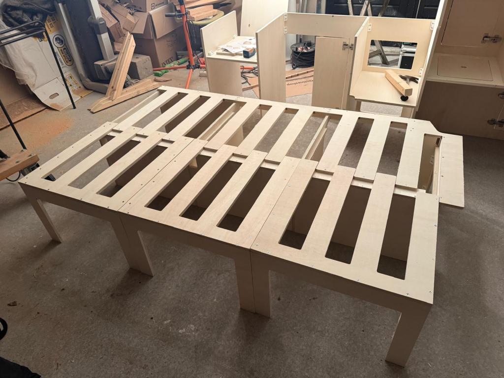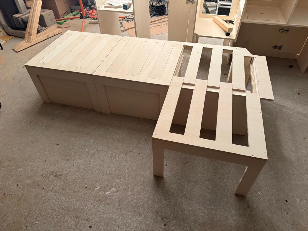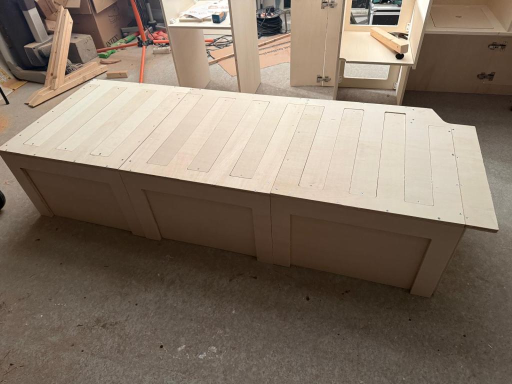 Afgelopen weekend hebben we verder geen pakketje met de overige bevestigingsmaterialen binnen gekregen dus in het weekend hebben we verder niets kunnen doen behalve het uitzoeken hoe de bedbank in elkaar gezet moet worden: dit is nogal een puzzeltje omdat de delen niet genummerd zijn. Daarnaast is de handleiding niet gedetailleerd genoeg om direct het juiste deel op de juiste plaats te bevestigen en zitten bij een paar onderdelen de voorgeboorde gaatjes niet aan de juiste kant en bij andere ontbreken ze. We zullen wat positieve feedback teruggeven! Inmiddels zijn de materialen geleverd en konden we verder met het in elkaar zetten van de bedbank. Omdat alles klaar was gezet kon het redelijk eenvoudig in elkaar worden gezet. Kostte een kleine 2 uurtjes werk. Dit weekend plaatsen we de bedbank in de bus, dan kan ik onderweg “ff horizontaal” als we dat willen. Het keukenblokje wacht ik nog op wat bevestigingsmateriaal dus die plaatsen we pas als we terug zijn uit Alvito!